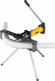 Мощный масляногидравлический привод с замкнутой гидравлической системой, не требующей техобслуживания. 2 опоры скользящих роликов и 2 скользящих ролика образуют закрытую гибочную раму для обеспечения высокой жесткости и точности в процессе гибки. Верхний скользящий ролик откидывается для легкого вкладывания и вынимания трубы, с отмеченными положениями для вставки для скользящих роликов согласно размеру сгибаемой трубы, со шкалой углов от 0 до 90°. Верхняя опора скользящих роликов со смещаемой в сторону опорной плитой скользящего ролика для изготовления изгибов с перегибом в зависимости от потребности и этажных изгибов на нескольких уровнях. Используется везде и без промедления. Настройка не требуется. Простая, легкая, быстрая работа, например дуга 90° Ø 63 мм всего 60 с. Подставка на 3-х ножках входит в оснастку. - Привод: